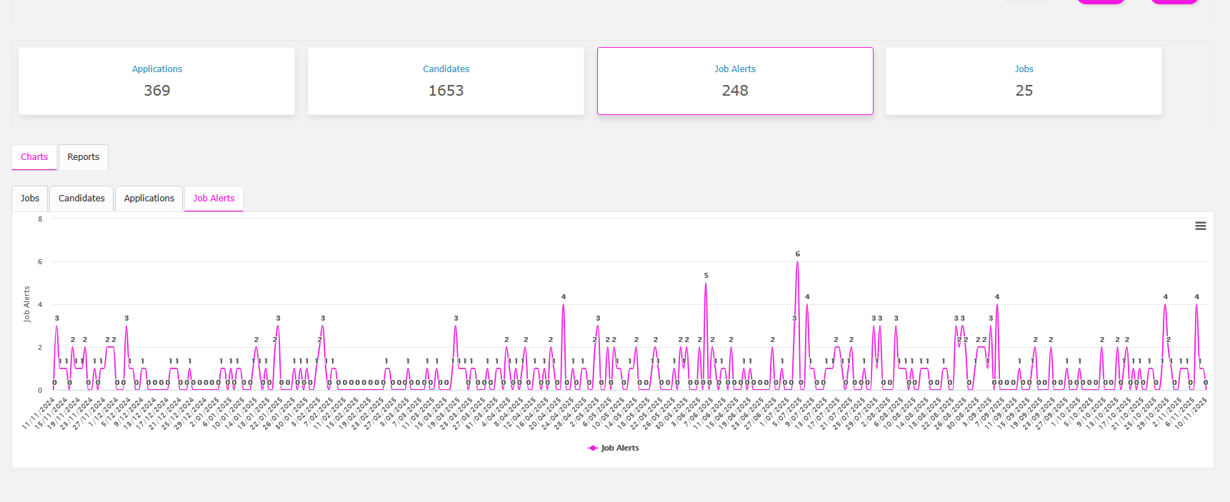 If you’d like to view how many job alerts have been created on your website over the past few weeks or months, you can access this data in your dashboard.